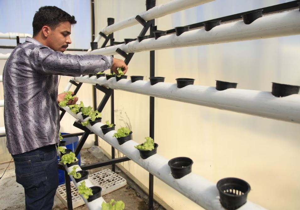 يزرع أبو صالح محاصيله في الماء بدلاً من التربة، حيث تمر المياه الغنية بالمغذيات عبر صفوف من الخس الأحمر والفراولة والزعتر قبل أن تعود إلى خزان الري.