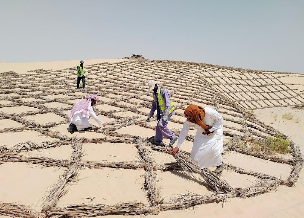 ولا تقتصر المبادرة على زراعة الأشجار فقط، بل تتضمن حلولًا مستدامة قائمة على الطبيعة، تثبيت الكثبان الرملية باستخدام سعف النخيل المجدول، وهي طريقة تقليدية مدعومة من الفاو والمركز الوطني لتنمية الغطاء النباتي (NCVC)، بهدف الحد من التعرية الريحية، والحفاظ على رطوبة التربة، وتحفيز نمو النباتات المحلية.